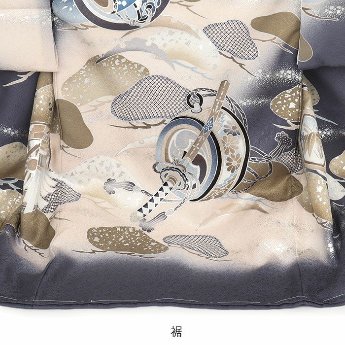 龍頭を付けるのは吉祥とされ大成を意味する兜に、軍馬に乗る鐙(あぶみ)が描かれた、勇ましさが感じられる豪華な柄ゆき。