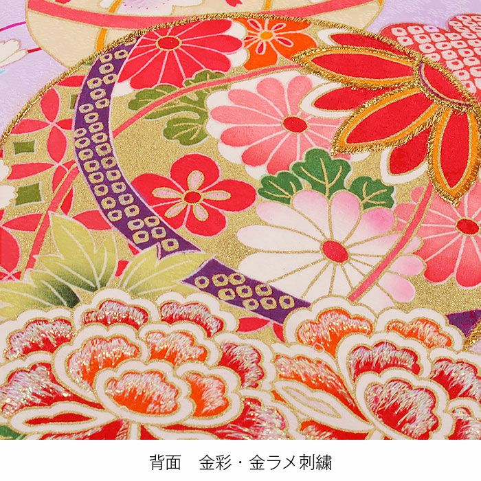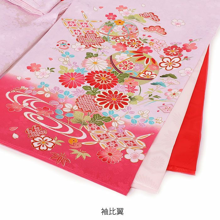色鮮やかに描かれた鞠を始め、牡丹や菊、桜などの吉祥花が描かれた麗らかで女の子らしいデザイン。