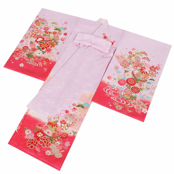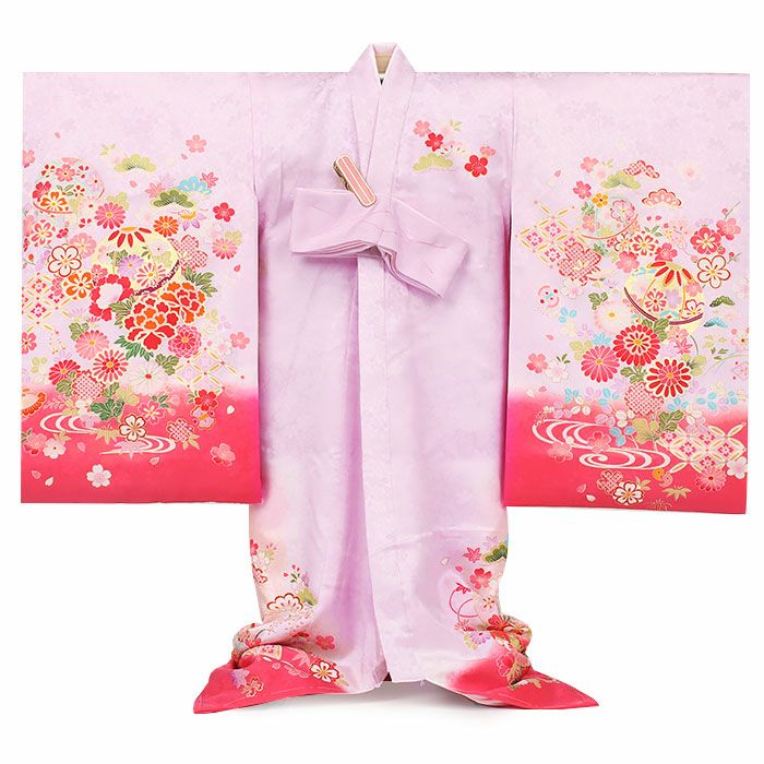 淡いパープル色からコーラルオレンジ、濃ピンク色とぼかし染めが施されており、柄を引き立てる華やかな印象に。