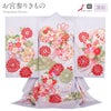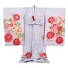 産まれて初めてのお祝い行事のお宮参り。 健やかな成長の願いなど、思いや願いがたくさんこめられた柄のお祝い着です。 ご家族の思いのこもったお着物にいかがですか。 薄紫色の地色に、牡丹などで彩られた花くす玉や雪輪が描かれた、麗らかで女の子らしいデザイン。 着物一面に散りばめられた花々が咲き誇り、ハレの日を美しく彩ります。 宝尽くし紋が描かれた雪輪をはじめ、おめでたい文様のひとつひとつに、お子様の健やかな成長や将来の活躍への願いが込められています。 華紋や雲取りには鹿の子で吉祥柄が描かれ、上品さの中にモダンな雰囲気です。 中央に描かれた牡丹には金糸やラメ糸で刺繍が施され、ふっくらとした質感や、上品な輝きが映える豪華な意匠。 柄の縁取りは金彩が施され、柄一つ一つが浮かび上がるような美しさを楽しみいただけます。 生地には高級感のある地模様が入り、光の加減でふわりと浮かび上がる逸品。 産着の表地は絹100%で仕立てておりますので、正絹ならではの柔らかな光沢と滑らかな肌触りが感じられます。 生まれたての赤ちゃんにも安心の日本製です。 着物と長襦袢の前身ごろには紐が縫い付けてありますため、仕付け糸を解いて頂ければすぐにご使用いただけます。 桜は春の花でもあるので、生まれた季節で選んでみる楽しみも。 ご姉妹での着用や、七五三にもお使いいただけます。 贈り物や保管の際に便利な化粧箱も別途販売しております。 生まれて初めてのお着物にお勧めの逸品、ぜひ手に取ってお楽しみくださいませ。