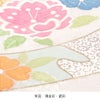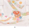 白地にやさしい色合いの鞠や熨斗をあしらい、その周りに牡丹や梅、桜などの吉祥花が咲き誇る、麗らかで女の子らしいデザイン。