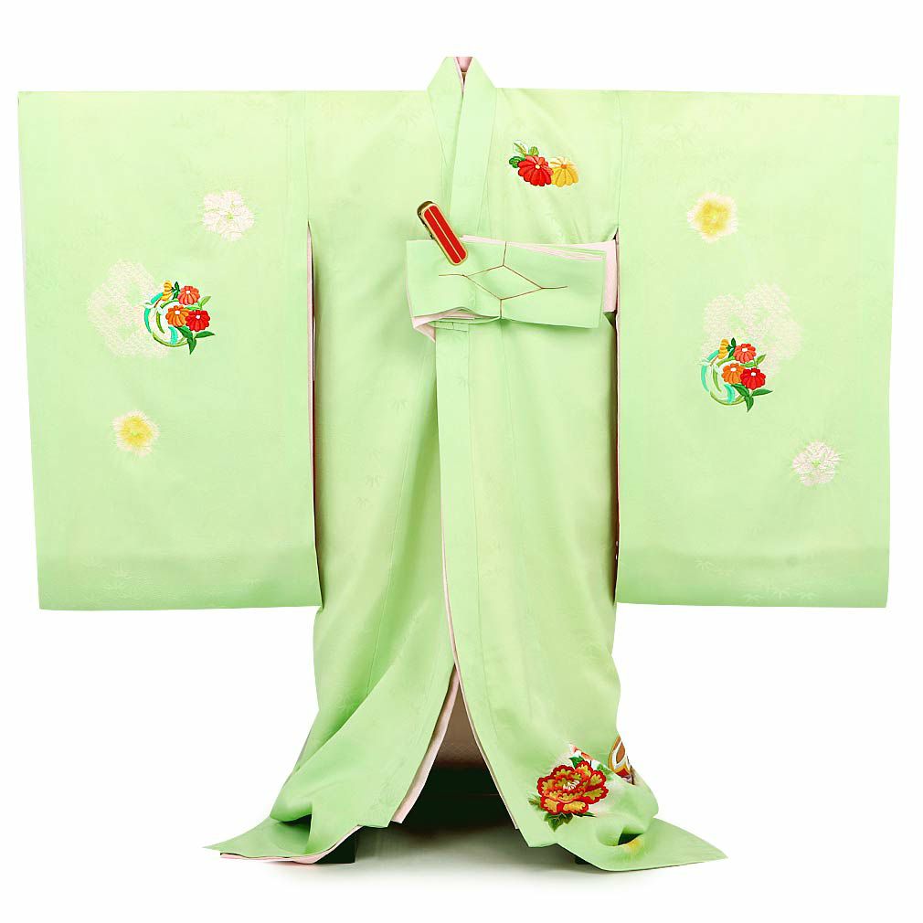 他の画像を見る 祝い着にふさわしい美しい正絹友禅 お宮参り 着物 女の子 産着 祝い着 薄緑 花車 万寿菊 桜 桃 橘 吉祥花 鹿の子 雪輪 吉祥紋 正絹 友禅 刺繍 金彩 新品 当店特別価格 ¥ 82,500 税込 カートに入れる お気に入りに登録する