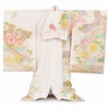 鹿の子紋様や七宝 流水などのおめでたい柄に花々が華を添える牡丹や万寿菊、桜などの日本の花々を乗せた麗らかで女の子らしいデザイン。