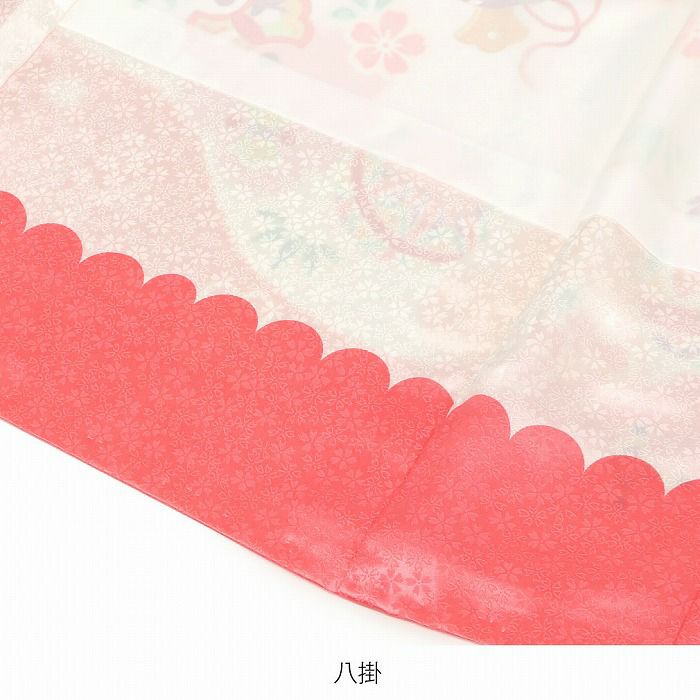 愛らしい鞠の周りに、小槌や分銅などの宝尽くし紋や鹿の子紋、桜などの花々が華を添える麗らかで女の子らしいデザイン。