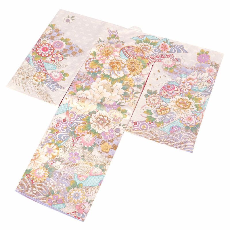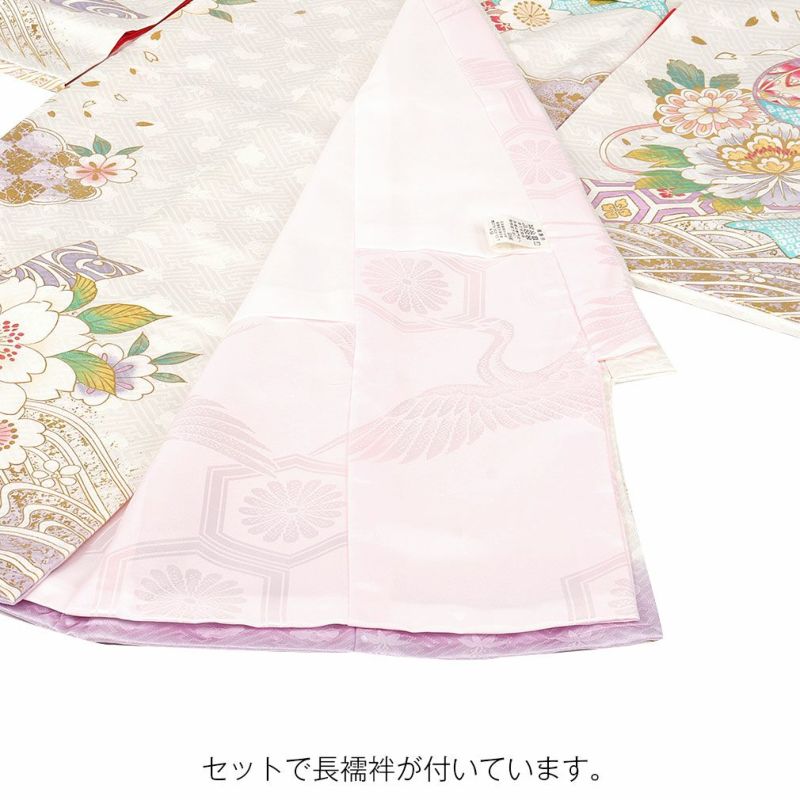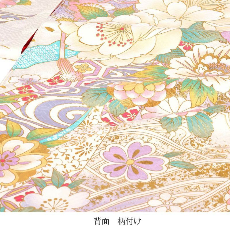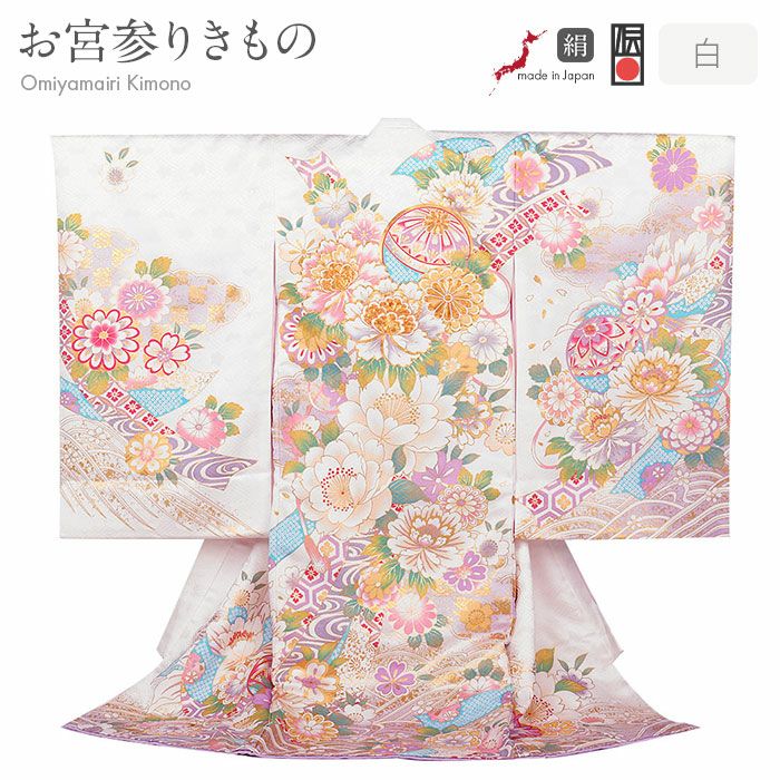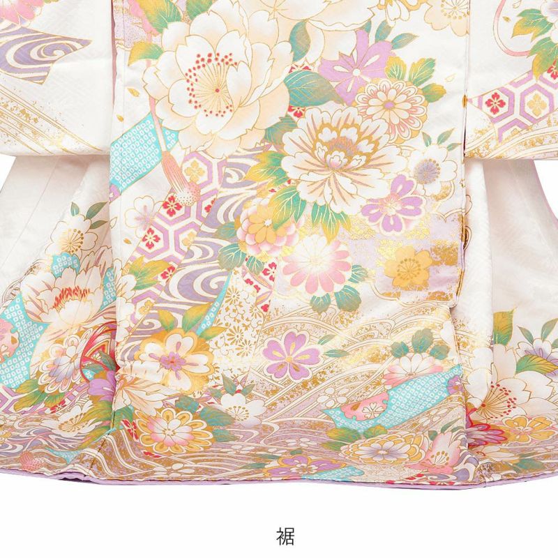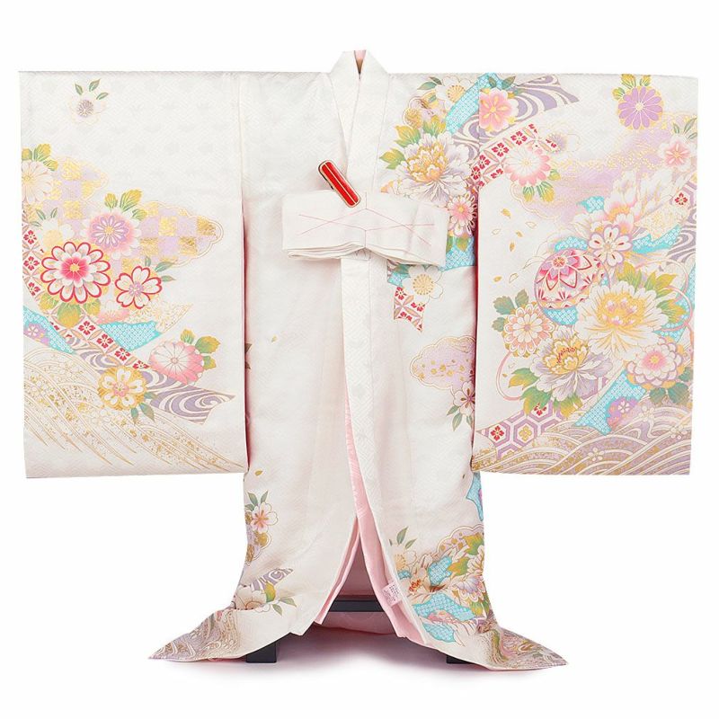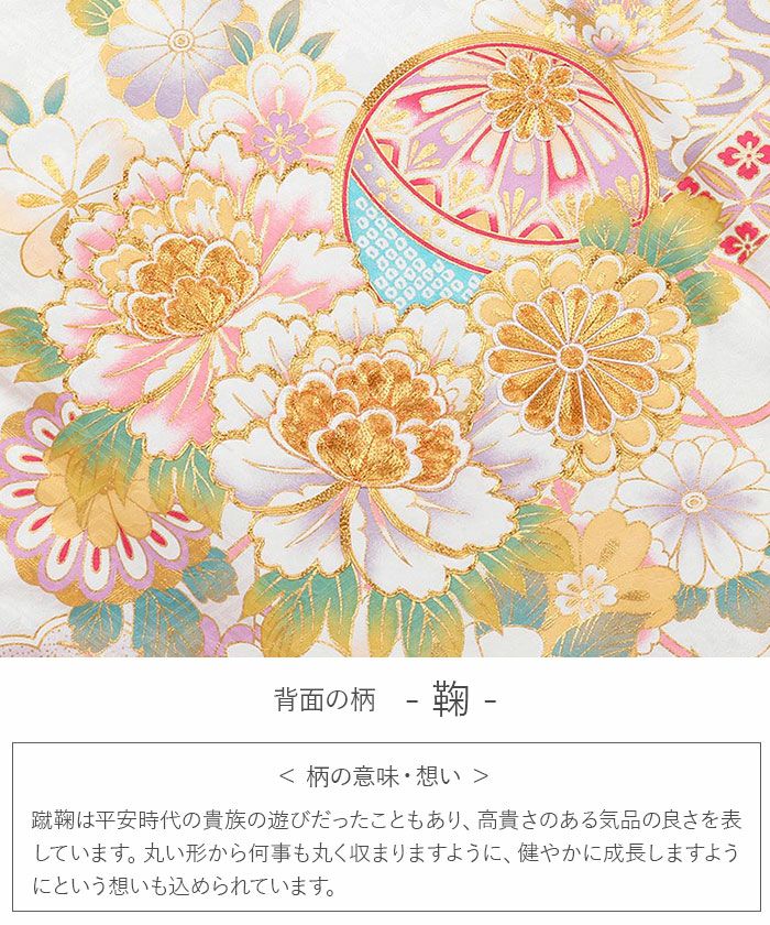 鹿の子紋様や七宝 流水などのおめでたい柄に花々が華を添える牡丹や万寿菊、桜などの日本の花々を乗せた麗らかで女の子らしいデザイン。