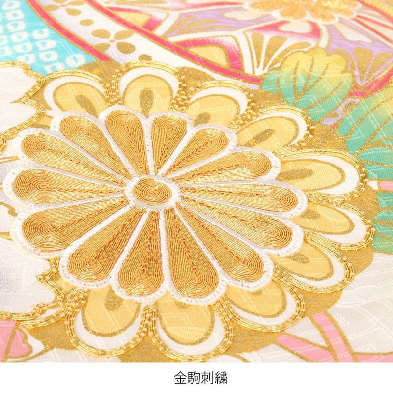 牡丹の縁取りや万寿菊の花びらには職人による丁寧な金駒刺繍が施され、浮かび上がる様などうっとりする程きれいなお着物です。