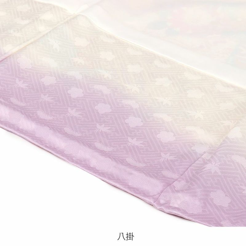 白色から紫色のグラデーションが施された色彩豊かな地色の着物には地紋が入り、光の加減で上品な模様がふわりと美しく浮かび上がります。