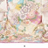 色鮮やかに描かれた万寿菊や桜の周りに、熨斗や流水紋が描かれた麗らかで女の子らしいデザイン。