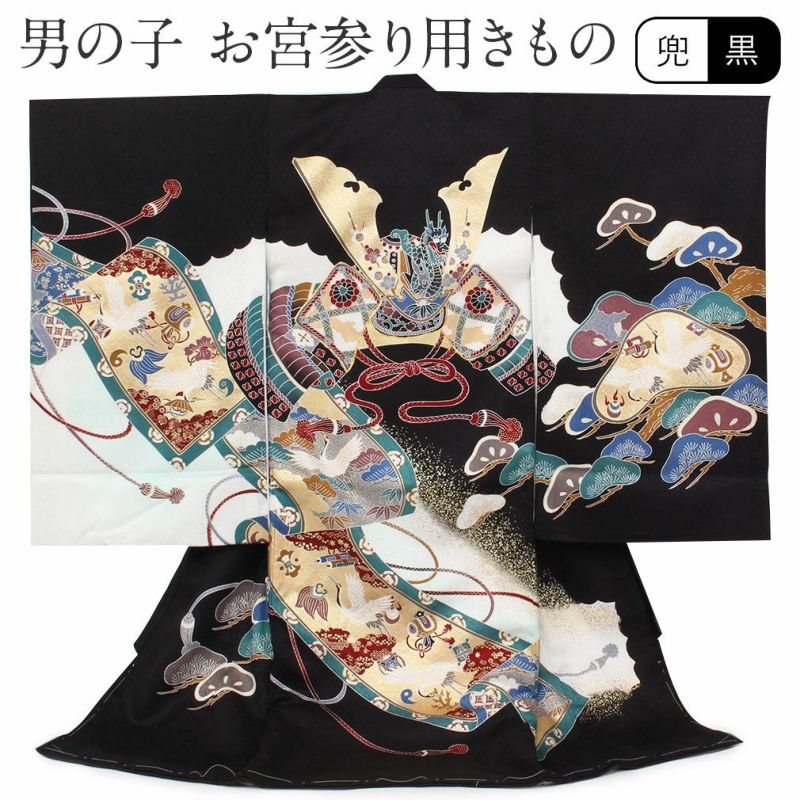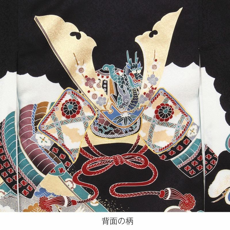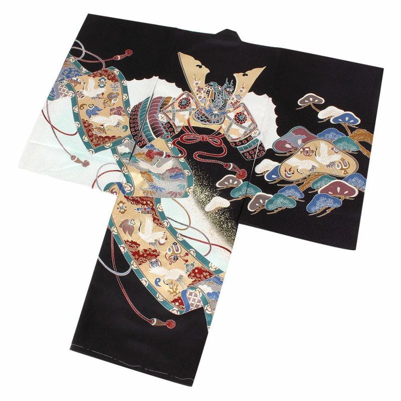 堂々とした兜に、金彩で彩られた巻物の中に鶴などの宝尽くしが描かれた柄ゆきが豪華で男の子らしい装いです。