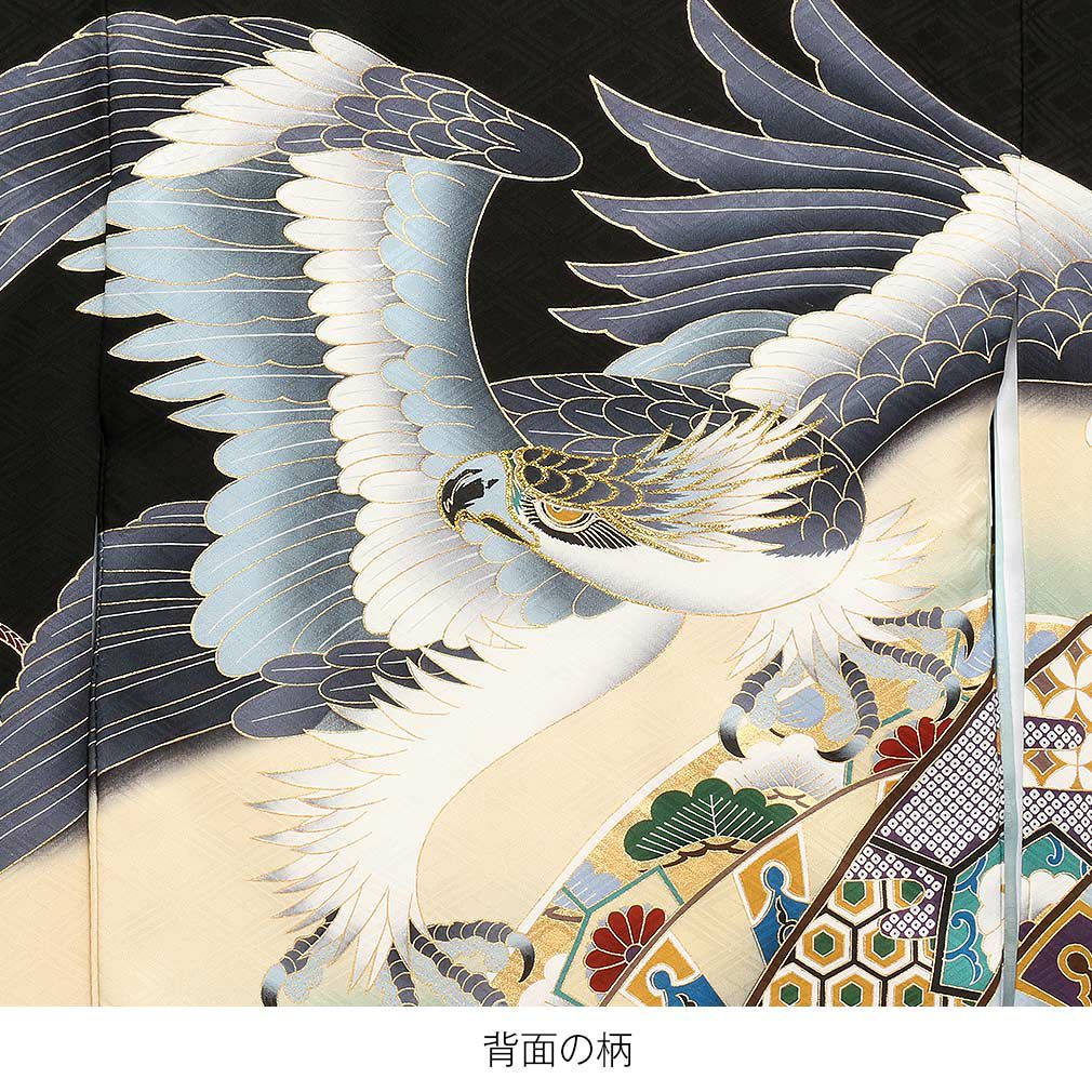 鷹の冠羽には金糸を使い豪華で煌びやかな刺繍があしらわれ、存在感あふれるデザインと装飾がお着物を彩ります。