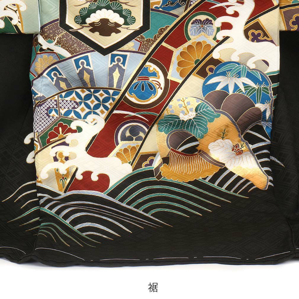堂々と描かれた鷹を始め、輪車文には縁起の良い吉祥文や宝尽くしなどがふんだんに描かれており、着物全体を豪華に演出します。