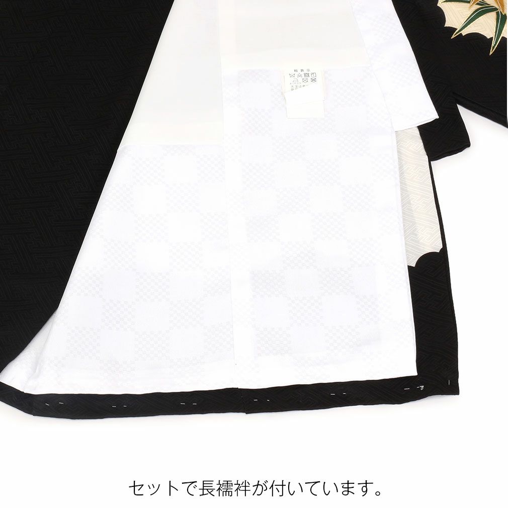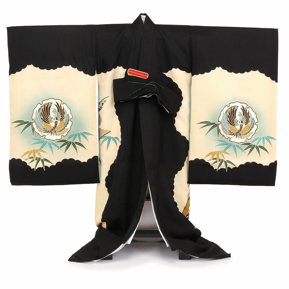 堂々と描かれた兜を始め、雪輪に鳳凰や、宝尽くしなどの縁起の良い吉祥文が、着物全体を豪華に演出します。