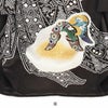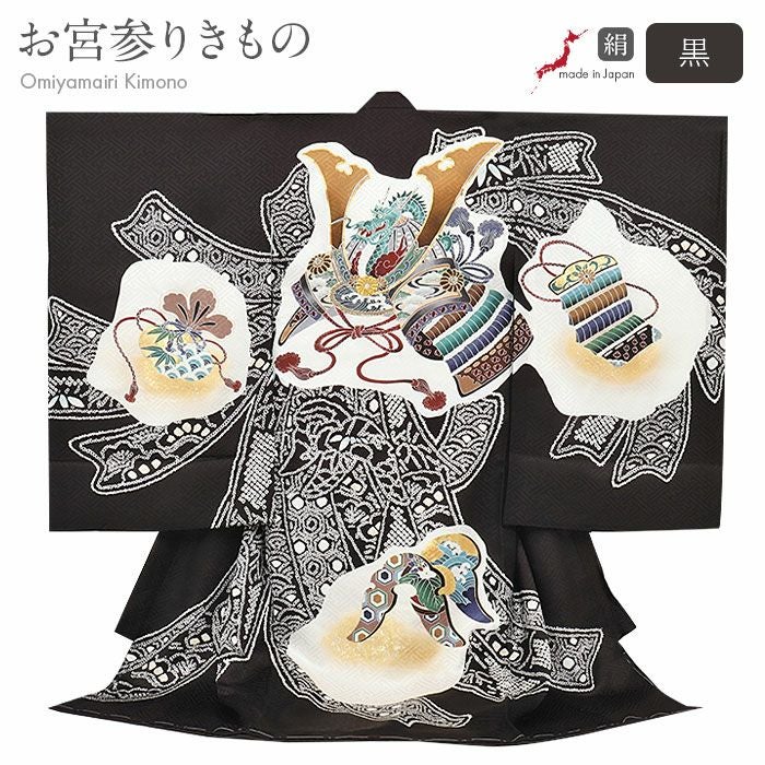 竜頭を配した兜をはじめ、甲冑や金嚢(きんのう)、馬具の一つである鞍橋(くらぼね)などを描いた、男の子らしい勇ましさが際立つ豪華な柄ゆき。