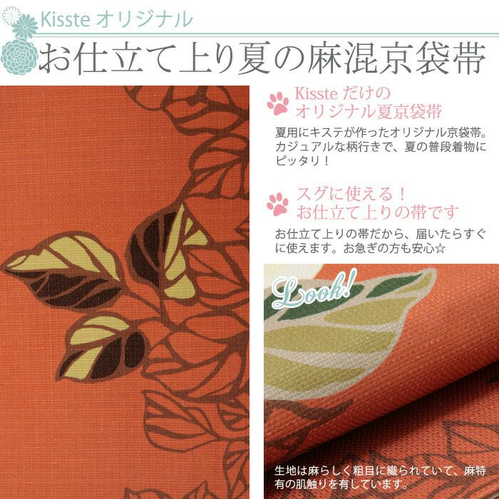 他の画像を見る 【最短日お届け】≪キステオリジナル≫初夏 盛夏 晩夏まで 暑い時期の単衣や薄物のお着物に 夏帯 京袋帯 <オレンジ/クレマチス> 絹 麻 日本製 <キステオリジナル> 仕立て上がり 当店特別価格 ¥ 41,800 税込 カートに入れる お気に入りに登録する
