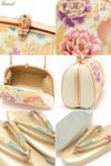 柔らかなクリーム系をベースにしたバッグ生地と花緒には、金糸をふんだんに使用して牡丹や桜などが織り込まれ、彩り豊かで高級感があり振袖スタイルに相応しい華やかさをもつ逸品です。