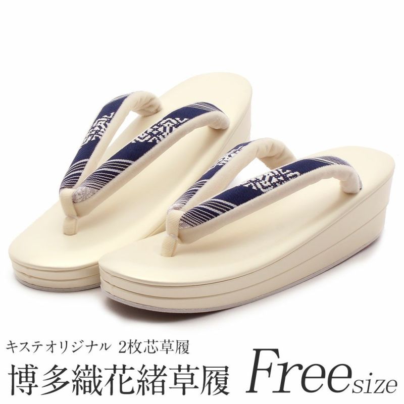 草履 お洒落用 <キステオリジナル> フリーサイズ Lサイズ 博多織花緒 <草履台:淡黄 花緒:紺/縞/献上柄>