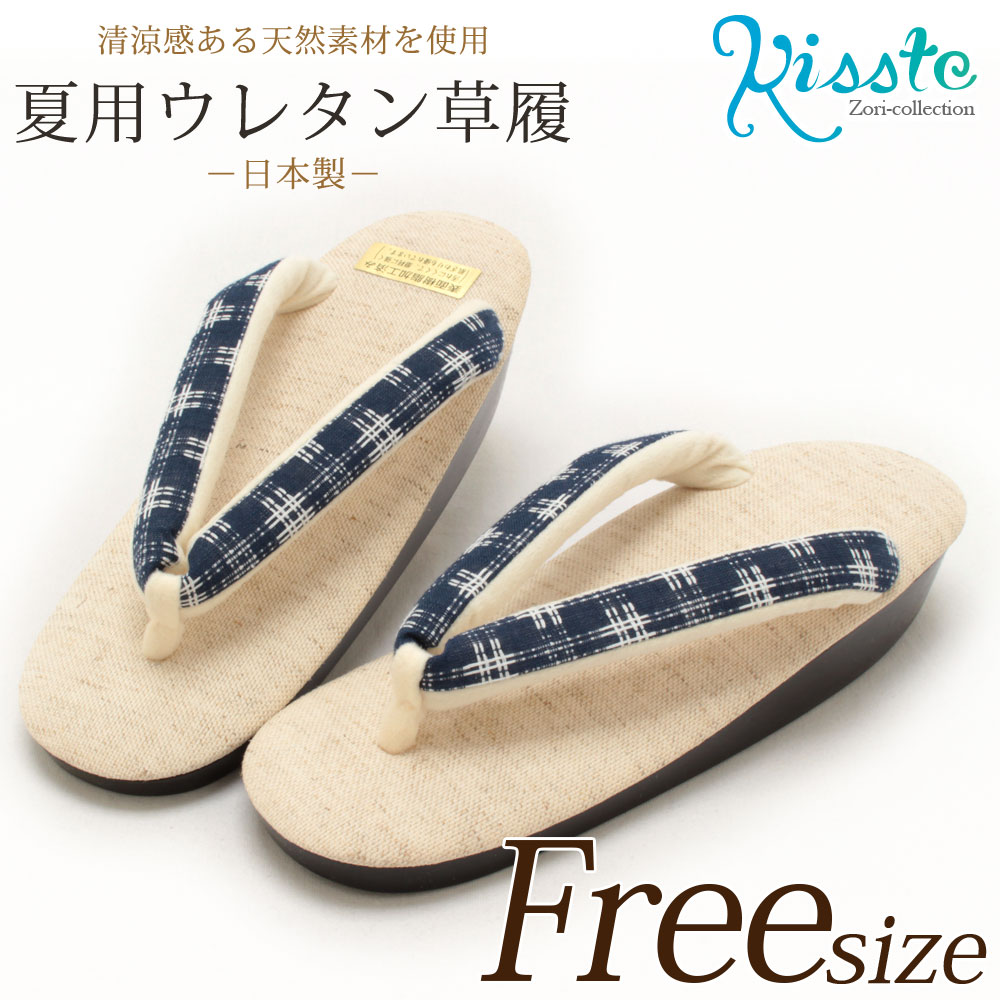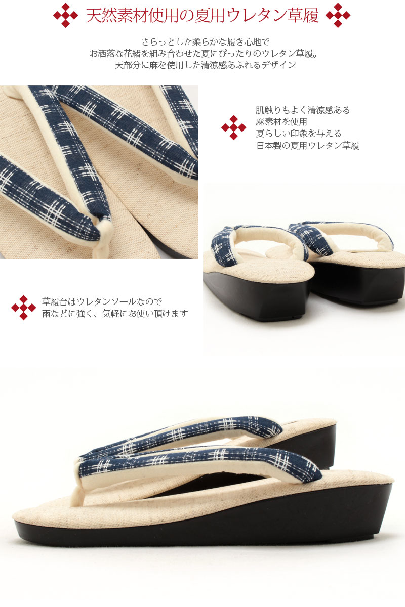 <夏用> ウレタン草履 お洒落用 <天然麻素材> フリーサイズ Lサイズ <紺青&クリームレモン/絣模様> 日本製 夏用お洒落草履