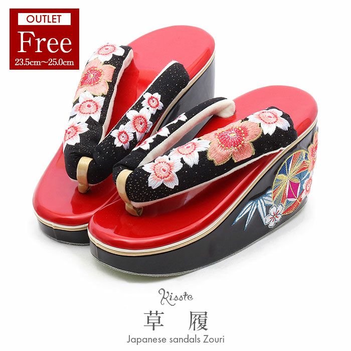 【アウトレット】草履 厚底 成人式 振袖 Lフリー黒 赤 桜 鞠 笹 刺繍 IKKO 草履 ぞうり 単品 着物
