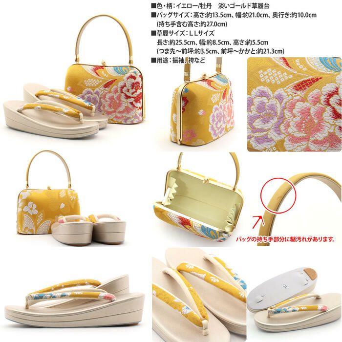 他の画像を見る 通常価格:38,500円 【アウトレット 在庫処分】成人式や結婚式の華やかな振袖に 【アウトレット】振袖 草履 バッグ セット 成人式 草履バッグセット 振袖用 振り袖 LL イエロー 牡丹 正絹帯地 日本製 当店特別価格 ¥ 16,500 税込 在庫切れ (0) 詳細を見る お気に入りに登録する
