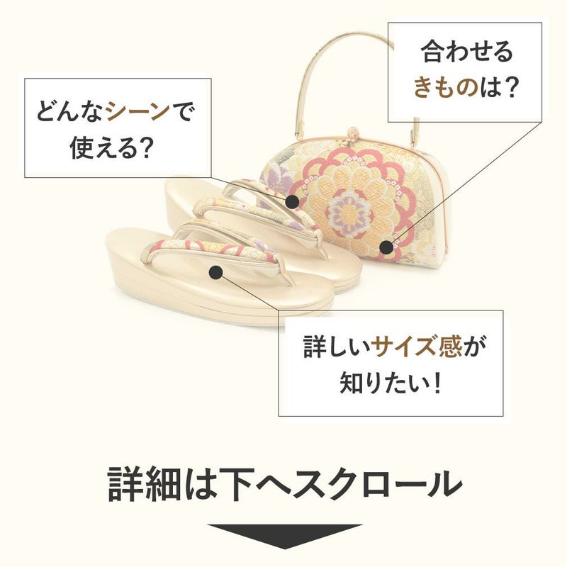 正絹の帯地を使用した振袖用草履バッグセットです。 煌びやかな帯地に描かれた花紋と桜が振袖スタイルをよりいっそう華やかにしてくれます。 織り込まれた金糸が角度によって煌びやかな輝きを放ち、お着物姿をさらに豪華に演出。 バッグと同じデザインの草履の花緒が統一感をプラスしています。 バッグは一本手で持ちやすく、お財布やスマートフォンなどが入る程良い大きさ。 バッグの開口部分は装飾を施した柔らかい銅色の飾り金具が煌めく華やかな装い。 口が大きく開くため、中身が一目でわかり、出し入れも便利です。 成人式の振袖を始め、卒業式の袴や結婚式のお呼ばれなど華やかな着姿にご利用いただけます。 お着物に合わせて美しいコーディネートをお楽しみください。