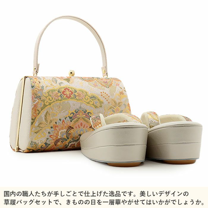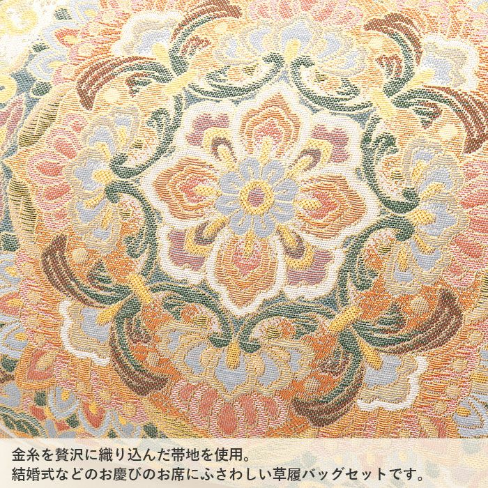 4. 留袖用草履バッグセット 訪問着用 草履バッグ フリー Lサイズ ゴールド 金茶 水色 桃色 花文 帯地 2枚芯 日本製