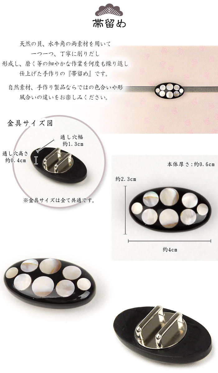 天然の貝・水牛角の両素材を用いて一つ一つ、丁寧に削りだし、形成し、磨く等の細やかな作業を何度も繰り返し、仕上げた手作りの『帯留め』です。