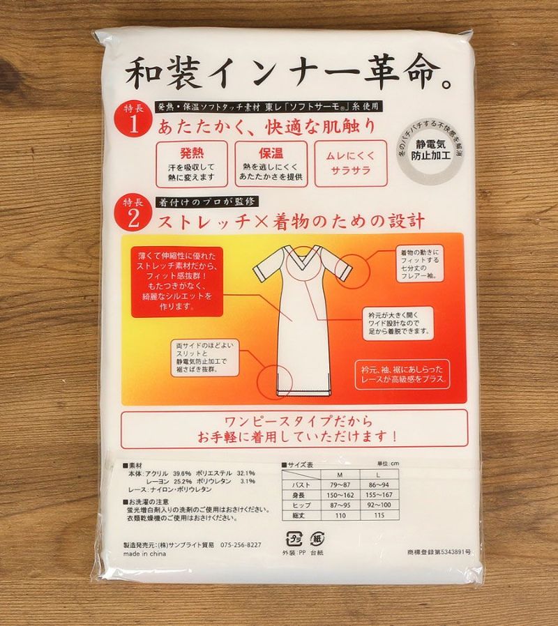 東レ「ソフトサーモ」糸を使用した、ヒート+フィット素材の和装ワンピースです。 ごく薄なのに温かく、着心地も快適! 発熱・保温性を兼ね備えた素材を使用しており、汗を吸収して熱に変え、熱を逃がさずキープし温かさを保ちます。 伸縮性に優れており、ストレッチ性抜群。 体にぴったりとフィットするので保温性が高く、蒸れにくい素材ですのでべたつかずサラサラ感が続きます。 襟元はワイド設計になっており、足からの着脱ができ簡単にお支度ができます。 袖は着物の動きにフィットするフレアー袖になっており、ひじまで温かく包み込みしっかりカバーします。 裾には深いサイドスリットが入っており、裾さばきしやすく快適。 静電気防止加工が施されており、ぱちぱちする不快感を軽減し、裾が足にまとわりつくのを防ぎます。 ワンピースタイプは肌着と裾除けが一体となっているため、おなか周りのシルエットがスッキリしていて着崩れしにくいです。 着付のプロが監修した、着物のための設計で快適な冬のきものライフをサポートします。