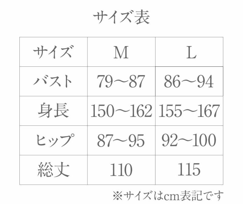 【Mサイズ】バスト:79~87cm 身長:150~162cm ヒップ:87~95cm 総丈:110cm 【Lサイズ】バスト:86~94cm 身長:155~167cm ヒップ:92~100cm 総丈:115cm
