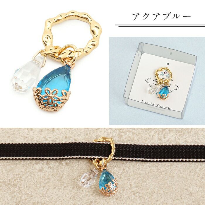■重ねても単品でも、自由に楽しむ帯のアクセント■ 雫のように揺れるストーンが、帯元にさりげない華やかさを添える帯留め。 単体でお使いいただくのはもちろん、お手持ちの帯留めに重ねて使えば、より華やかな帯元を演出できます。 クリスタルガラスの雫モチーフとゴールドの透かし細工が上品にきらめき、 普段のおしゃれ着からお出かけスタイルまで幅広く活躍します。 複数個付けもおすすめです。 リサイクル着物や古着などのめぐりもののお着物でも、小物を新調することでブラッシュアップされた印象に。 普段のお出かけから特別な日まで、装いに可憐なアクセントをプラスします。