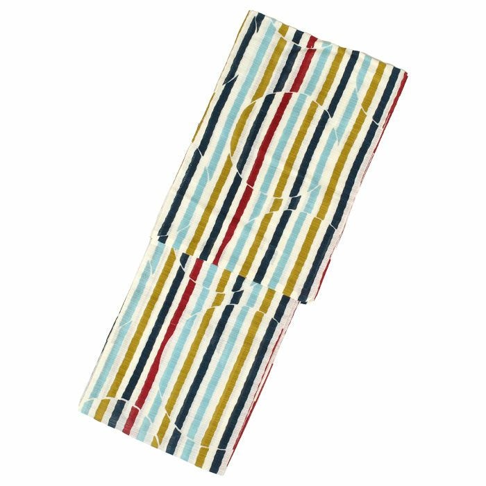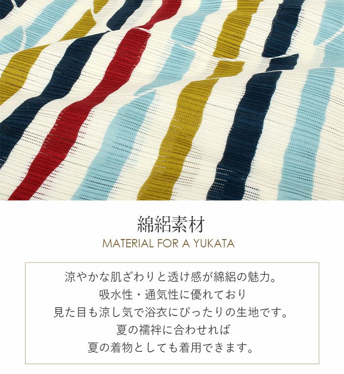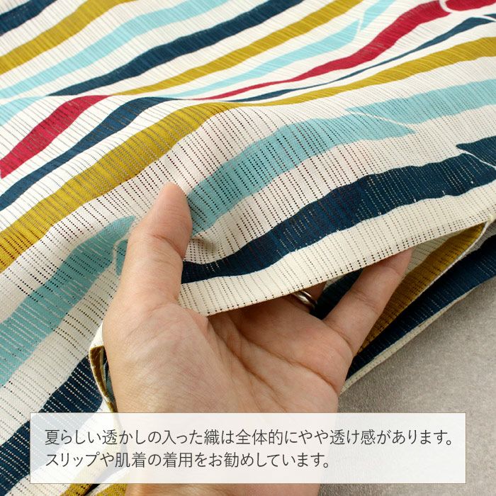 浴衣 単品 《岡重》 クリーム地に青・水色・紅系 縞に丸 綿100% 綿絽
