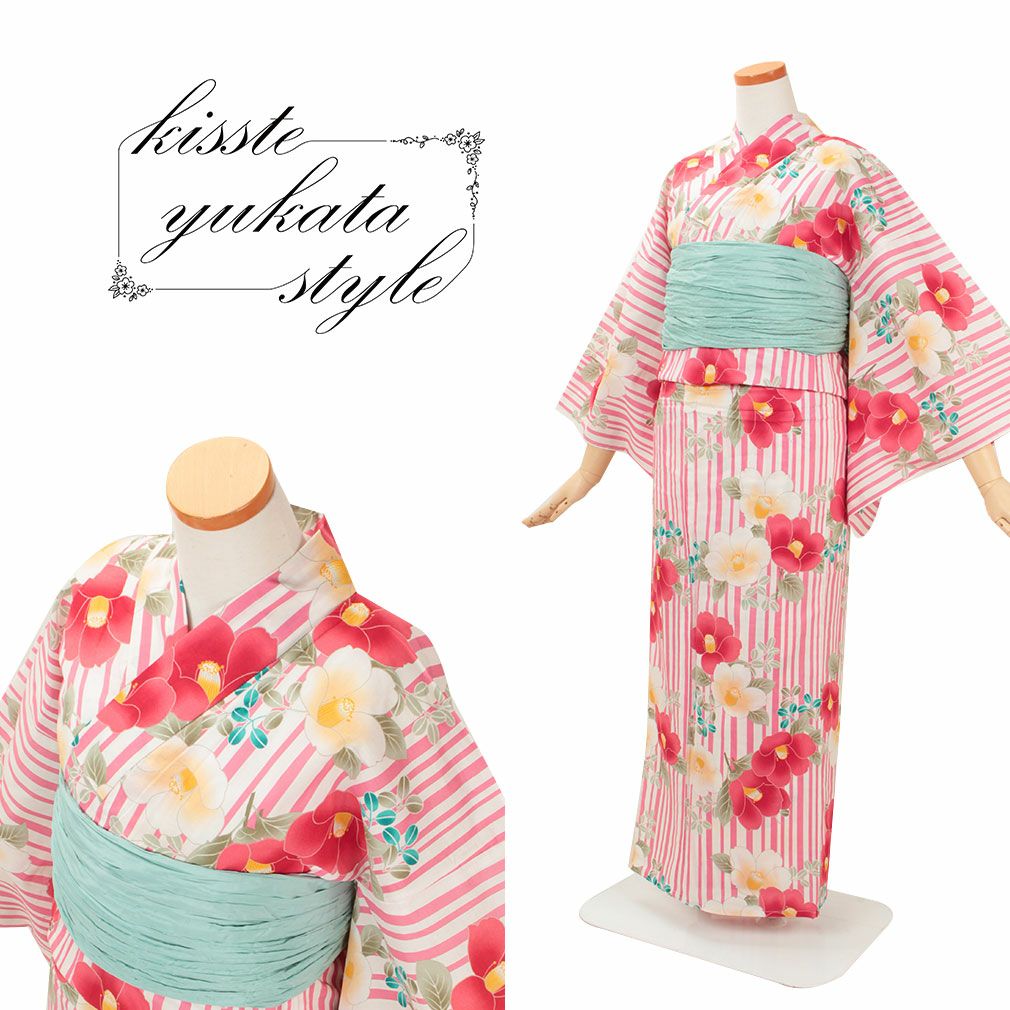 浴衣 単品 《キスミス》お仕立て上がり浴衣 <オフホワイト・ピンク/ストライプに椿> 綿100%
