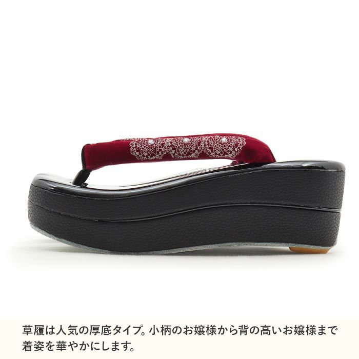 他の画像を見る ≪在庫限り≫ カジュアルな普段着きものに 草履 レディース 普段用 カジュアル草履 振袖用 成人用 紗織 沙織 M L 赤 レッド ワイン 合皮 2枚芯 Hi-クッション EVA素材 日本製 当店特別価格 ¥ 19,800 税込 お気に入りに登録する