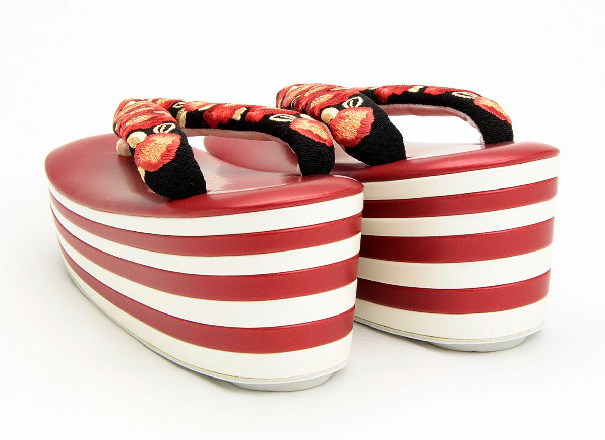 草履 成人式 振袖用 <ハイヒール> Lサイズ フリーサイズ 厚底 重ね<赤 白/牡丹 黒 刺繍>