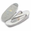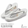 匠の技術が集結された、日本製の履きやすさ抜群の本革礼装用草履です。 高級感ある本革独特の輝きと艶を放つ草履台には、幾何学模様の型押しが施され、礼装時に相応しい貴賓と風格のあるデザインです。 かかとの高さは約5.3cmと程良いヒール高の高級3枚芯草履。 草履台はつま先が2枚芯、かかとが3枚芯(2の3枚芯)の中にはそれぞれクッション板が施されたこだわりの逸品です。 芯には細かな金銀箔が散りばめられ、足元から更なる豪華さを演出しています。 花緒は足の痛みを和らげる二石優花緒を使用。 高級な皮革生地を使用し、柔らかなクッション加工で衝撃にも強く、長時間の歩行も疲れを感じさせない逸品です。 結婚式や披露宴などの黒留袖や色留袖をはじめ、訪問着や色無地など、フォーマルからセミフォーマルまで幅広くご利用いただける履き心地抜群の本革草履です。