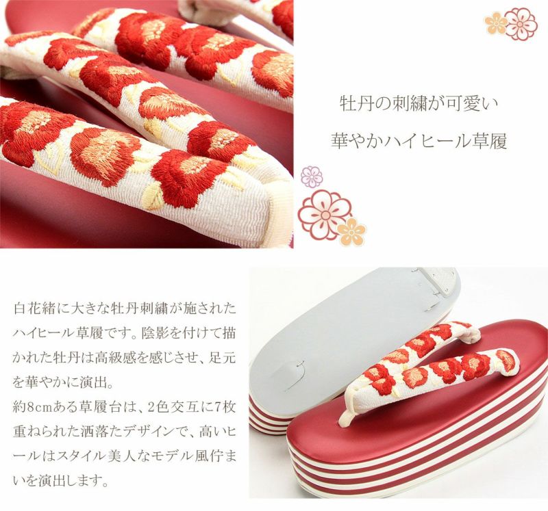 他の画像を見る ≪在庫限り≫ 振袖・袴用 花緒の牡丹と7枚の重ね芯が粋な、ハイヒール草履。 草履 成人式 振袖用 <ハイヒール> Lサイズ フリーサイズ 厚底 重ね<黒 白/牡丹 赤 刺繍> 当店特別価格 ¥ 41,800 税込 (0) カートに入れる お気に入りに登録する