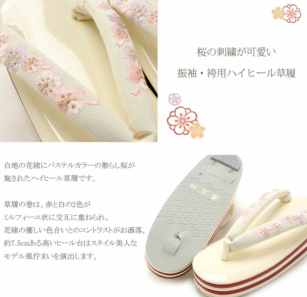 他の画像を見る <華三彩> 刺繍が華やかな振袖用ハイヒール草履 草履 振袖用 <華三彩> フリーサイズ Lサイズ <4枚芯重ね台/桜刺繍>赤白台 当店特別価格 ¥ 30,800 税込 (0) カートに入れる お気に入りに登録する