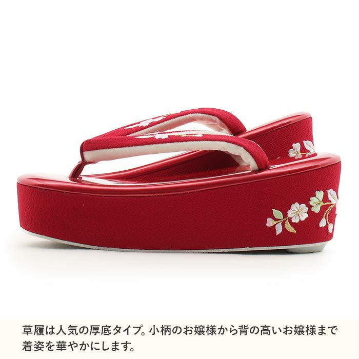 成人式や結婚式での振袖や卒業袴といった、華やかなおきものの装いに合わせていただける草履をご用意致しました。 東京・浅草製の有名ブランド「紗織」の振袖&袴用草履です。 艶やかで光沢のあるエナメル台に、花刺繍入りのちりめん生地を組み合わせた華やかな雰囲気。 人気の厚底タイプの草履が、振袖や袴姿をさらに豪華に演出します。 ちりめん生地を使用した花緒や巻き(側面)には、花刺繍が丁寧に施されており、金糸が煌めき上品に足元を彩ります。 シボと呼ばれる凹凸が特徴のちりめん生地に、ふっくらとした刺繍が浮かび上がりワンランクアップの和装の着こなしに。 横からのスタイルに華やかさを添えます。 草履のかかと部分にも刺繍が施されており、後ろ姿のアクセントになっています。 花緒がふんわりと柔らかいので、足に優しい作り。 身長をヒールアップしたい小柄のお嬢様にも、かかと高約7cmのヒールは嬉しい高さ。 小柄なお嬢様はもちろん身長の高いお嬢様の着姿も美しく魅せます。 草履台には、耐久性の高い合成皮革を使用しています。 厚底ながら、高低差の少ないなだらかな曲線で歩きやすく、初心者の方にも安心の履き心地です。 ソール部分にはゴム素材を使用。滑りにくい仕様となっています。 お母様やお姉様の振袖を受け継いで、草履を新調したコーディネートにするお嬢様も多くいらっしゃいます。 レンタル店や写真館などでは貸し出しの草履もありますが、何より新品の草履はご自身のお足に馴染みやすく、レンタルではなかなか出回らない繊細なお作りやお洒落なデザインの草履は振袖コーデの中でもぱっと目を引く存在になるでしょう。 華やかな装いを楽しみたい日のおともに、ぜひお手に取っていただきたい草履です。