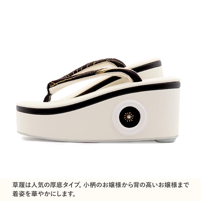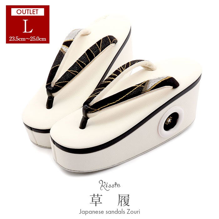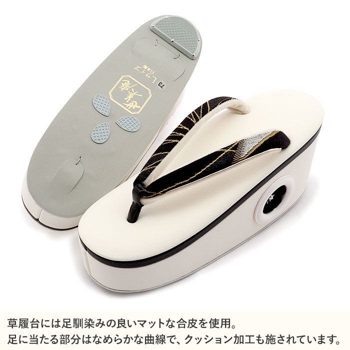 他の画像を見る ≪在庫限り≫ 成人式や結婚式の華やかな振袖や卒業袴に 【アウトレット】振袖草履 成人式 草履 振袖 ぞうり 成人用 レディース 世美庵 Lサイズ ホワイト 白 ブラック 黒 金 花 帯地 合皮 1枚芯 厚底 ハイヒール 日本製 当店特別価格 ¥ 19,800 税込 お気に入りに登録する