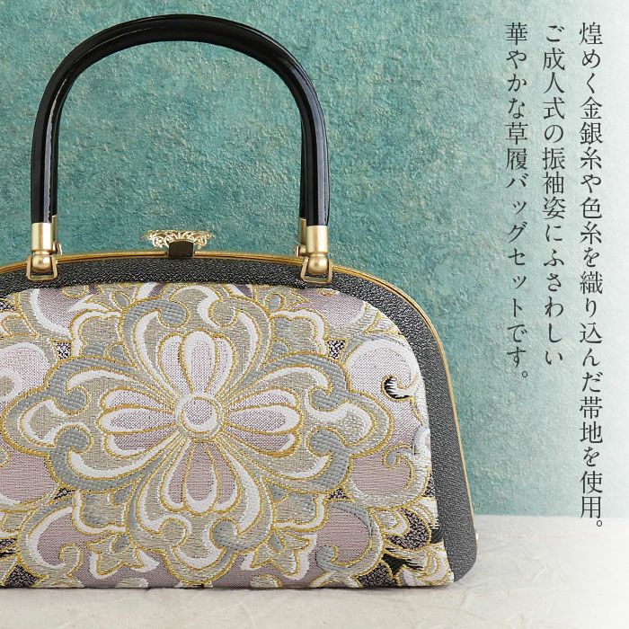 他の画像を見る 草履バッグセット 成人式 振袖用 <世美庵> Sサイズ Mサイズ Lサイズ LLサイズ 西陣袋帯地使用 3枚芯<ゴールド・シルバー/菊華紋> 当店特別価格 ¥ 55,000 税込 お気に入りに登録する