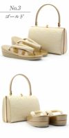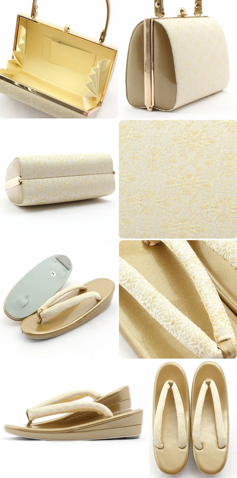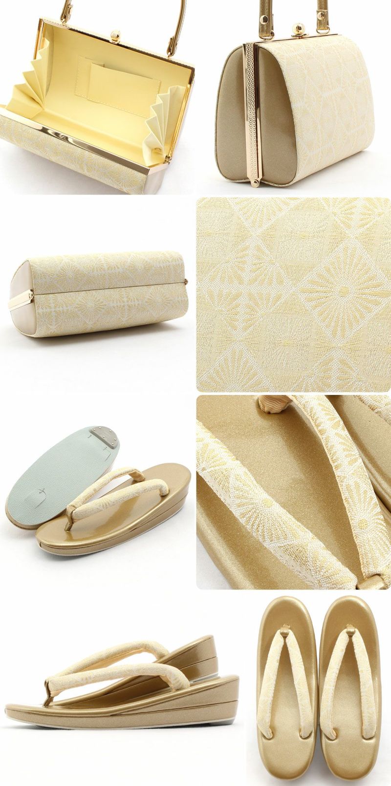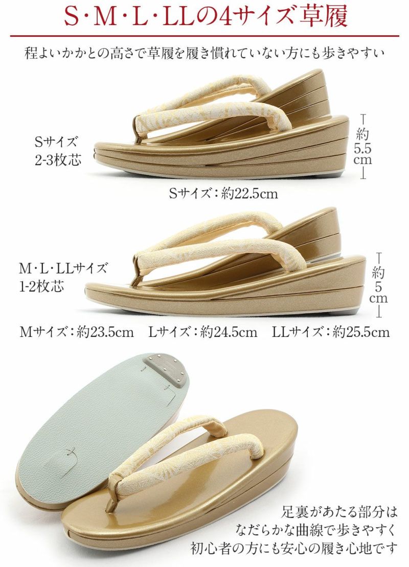 礼装用草履バッグセットをお手頃な価格でご用意いたしました。 上品に煌めく金銀糸が織り込まれた帯地を使用した、どんなフォーマル着物にもコーディネイトしやすいセットとなっております。 色はゴールドとシルバーの2色展開、柄は全部で3柄取り揃えております。 草履のサイズは、22.0~26.0cmまでの小さいサイズから大きいサイズまで対応可能なS・M・L・LLの4サイズ展開。 かかとの高さは5~5.5cm前後と着物初心者の方にも扱いやすいお草履となっております。 草履の天部分(表面)にはクッション性のある素材を使用しているので歩きやすく、長時間の歩行も疲れを感じません。 結婚式や披露宴の黒留袖や色留袖、訪問着をはじめ、入学式やパーティーなどフォーマルなシーンで幅広くご利用いただける礼装用草履バッグセットです。
