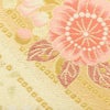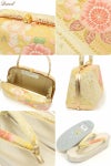 ゴールドをベースとした京都・西陣織の正絹袋帯地を使用したバッグ生地と花緒は、優しい色使いの桜や辻ヶ花が織り込まれた、フォーマルなシーンに相応しい華やかで上品なデザインです。