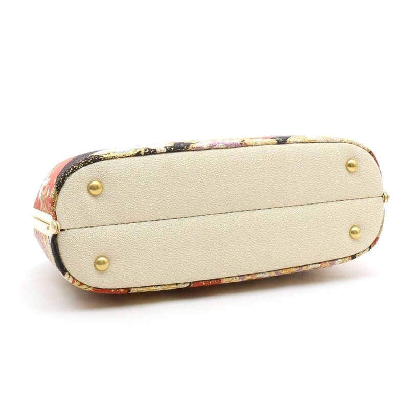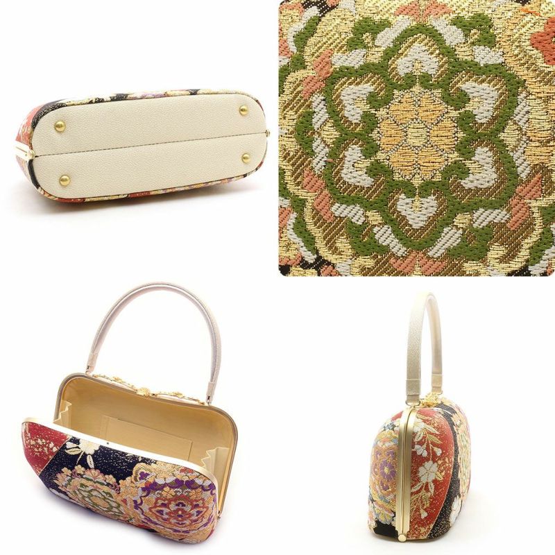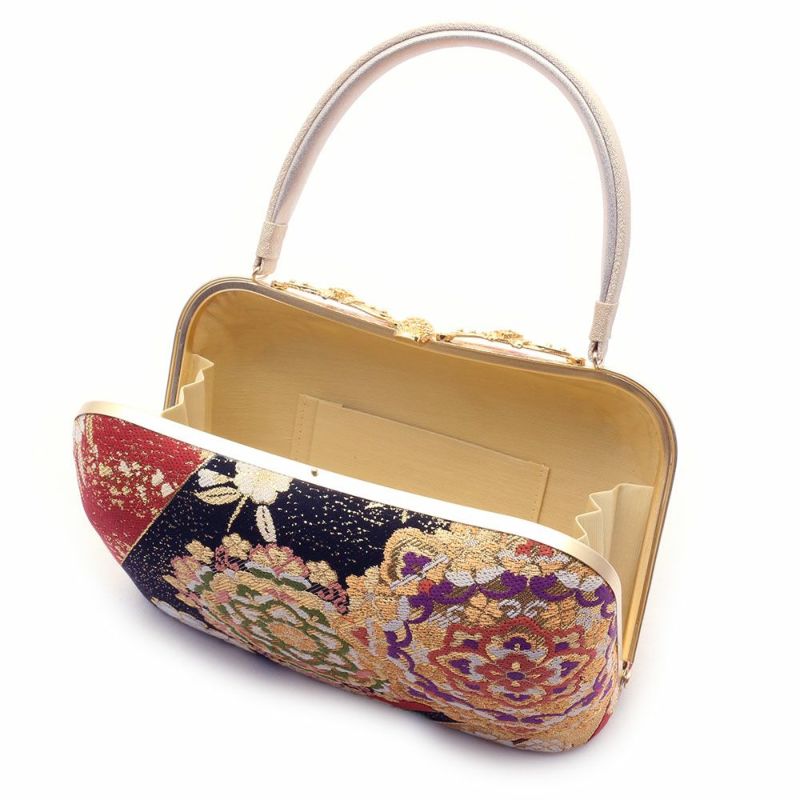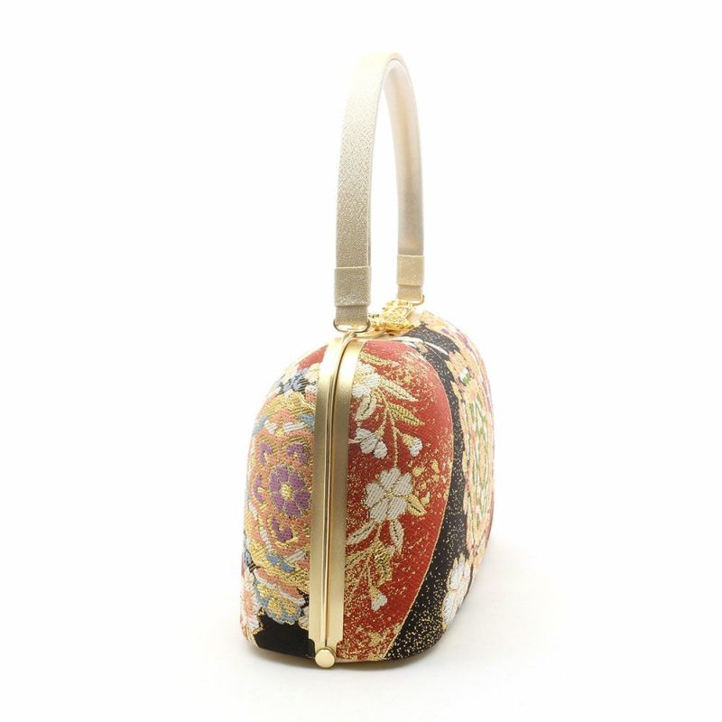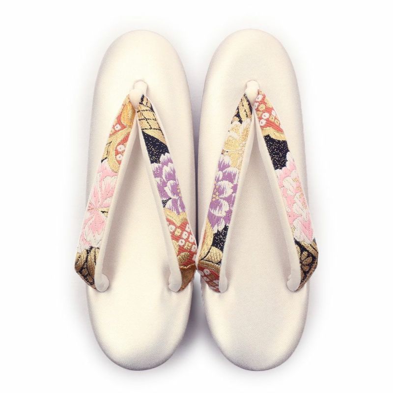 京都西陣の袋帯地を使用したバッグ生地と花緒には、金糸をふんだんに使用して柄を描いた、鮮やかで豪華なデザインです。