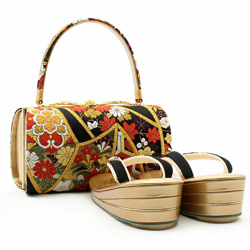 草履バッグセット 振袖用 フリーサイズ Lサイズ 日本製 京都西陣 <ブラック/吉祥花尽くし>