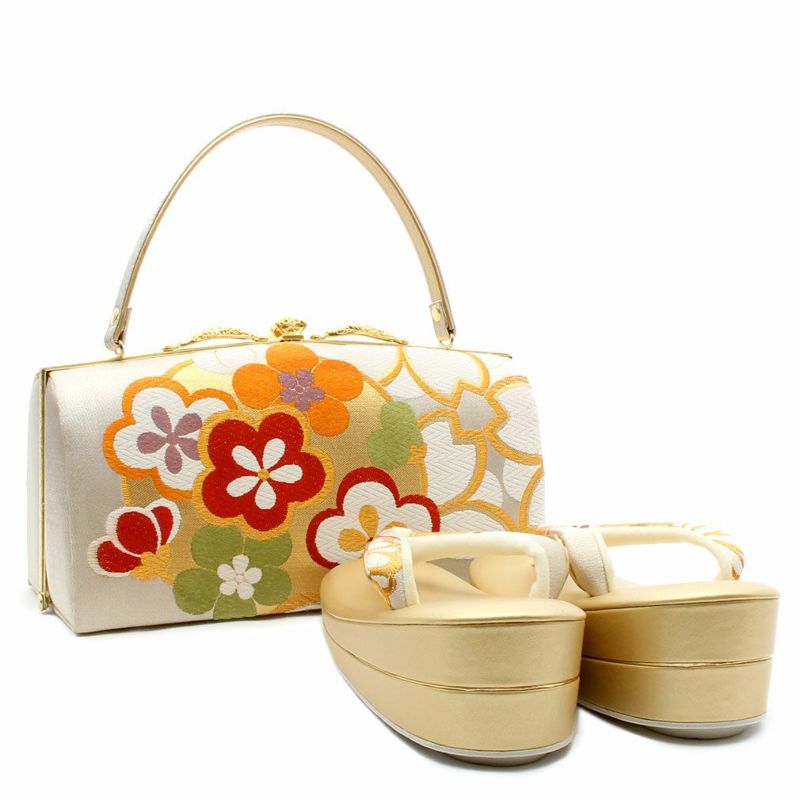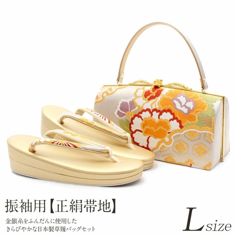 草履バッグセット 振袖用 Lサイズ 正絹帯地 <シャンパンゴールド/牡丹に雪輪> 日本製