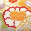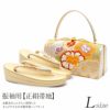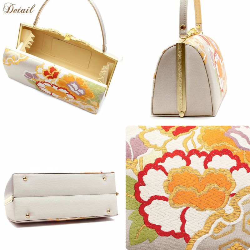シャンパンゴールドをベースに、金糸をふんだんに使用して牡丹に雪輪や七宝紋様が織り込まれたバッグ生地と花緒は、彩り豊かで高級感があり、 振袖姿に相応しい華やかさをもつ逸品です。