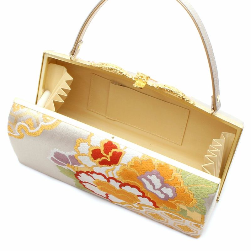 バッグの容量は折り畳みのお財布や携帯電話などが入る程良い大きさ。 成人式の振袖を始め、訪問着などのフォーマルな装いにも幅広くご利用いただけます。