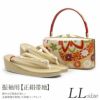 正絹帯地を使用した振袖用草履バッグセットです。 開口部分は繊細な装飾を施した口金が煌めく格調高い雰囲気。 バッグ生地と花緒には、鞠や桜や梅が色鮮やかに織り込まれ、振袖に相応しい上品で華やかさのあるデザイン。 織り込まれた金糸が角度によって煌びやかな輝きを放ち、お着物姿をさらに豪華に演出します。 バッグと同じデザインの草履の花緒が統一感をプラスし、より豪華な佇まいに。 艶を抑えた上品なゴールドの草履は、かかとの高さが約5.5cmと程良いヒール高。 あまり背は高くなりにくく、半月を2枚入れることで草履の反りが足にやさしくフィットする一の三枚芯の草履です。 草履の幅はやや広めになってるので、草履が慣れていない方や足の幅が広めな方にも楽に履いて頂けます。 花緒部分に柔らかな生地を使用ており履き心地も良く、長時間の歩行も疲れを感じさせない逸品です。 バッグの容量は、お財布やスマホなどが入る程良い大きさ。 底面には底鋲が取り付けられており、汚れや傷が付きにくくなっています。 成人式や結婚式の振袖をはじめ、謝恩会や卒業式など晴着スタイルにご利用いただけます。