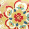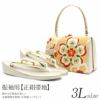 正絹帯地を使用した振袖用草履バッグセットです。 バッグの開口部分は繊細な装飾を施した口金が煌めく格調高い雰囲気。 バッグ生地と花緒には、華紋や熨斗や亀甲、鹿の子紋が色鮮やかに織り込まれ、振袖に相応しい上品で華やかさのあるデザイン。 バッグの背面にも同じ華紋が描かれた、見る人を楽しませるおめでたい柄行き。 織り込まれた金糸が角度によって煌びやかな輝きを放ち、お着物姿をさらに豪華に演出します。 クッション入りの持ち手は、ふっくらとした質感で手触りの良さが楽しめます。 バッグと同じデザインの草履の花緒が統一感をプラスし、より豪華な佇まいに。 艶を抑えた上品なシャンパンゴールドの草履は、かかとの高さが約5.5cmと程良いヒール高。 あまり背は高くなりにくく、半月を2枚入れることで草履の反りが足にやさしくフィットする一の三枚芯の草履です。 草履の幅はやや広めになってるので、草履が慣れていない方や足の幅が広めな方にも楽に履いて頂けます。 花緒部分に柔らかな生地を使用ており履き心地も良く、長時間の歩行も疲れを感じさせない逸品です。 バッグの容量は、お財布やスマホなどが入る程良い大きさ。 底面には底鋲が取り付けられており、汚れや傷が付きにくくなっています。 成人式や結婚式の振袖をはじめ、謝恩会や卒業式など晴着スタイルにご利用いただけます。