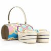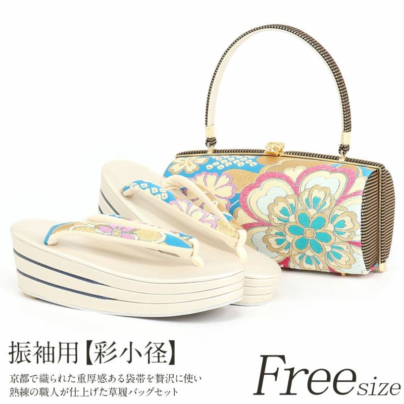 彩小径謹製の帯地を使用した振袖用草履バッグセットです。 バッグ生地と花緒には、上質な金糸の入った帯地で紋様が織り込まれ、振袖姿に相応しい可愛さと華やかさを併せ持つデザインです。 カラフルなデザインがワンポイントとなり、バッグに華を添えます。 金糸が角度によって煌びやかな輝きを放ち、お着物姿をさらに豪華に演出します。 草履にはバッグと同じデザインの花緒が統一感をプラスし、より豪華な佇まいに。 また、芯と芯の間には高級感を演出する金ラインが入った3枚芯。 クッション加工が施されており、歩きやすくとても履き心地がよく足への負担を軽減します。 かかとの高さは約6.5cmとハイヒール草履なので振袖の着姿をスタイルよく魅せてくれますよ。 バッグの容量は、お財布や携帯電話などが入る程良い大きさ。 成人式の振袖を始め、卒業式の袴など華やかな着姿にご利用いただけます。 年代も問わず、末永くご愛用いただける最高級ブランド「彩小径」をぜひお客様の目でお確かめ下さい。