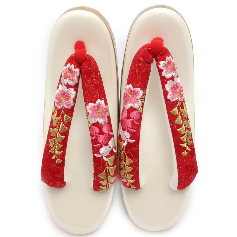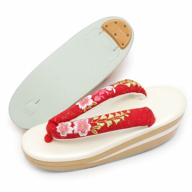 鮮やかな赤と白の生地のバッグには桜と藤の刺繍が施され、振袖姿に相応しい可愛さと華やかさのあるデザインです。 バッグは、2通りのパターンでご利用いただけます。 (1)チェーンをバックの中に入れて、クラッチバックとしてお使いいただけます。 (2)チェーンを出して、ハンドバックとしてお使いいただけます。 携帯電話やお財布など、必要なものが入る程良い大きさです。 草履の花緒にも桜と藤の刺繍が施され、バッグと同じデザインが統一感をプラス。 草履台はかかとの高さは約6cmと程良いヒール高。 歩きやすくとても履き心地がいい逸品です。 成人式や卒業式、謝恩会といった振袖スタイルに最適な、振袖用草履バッグセットです。